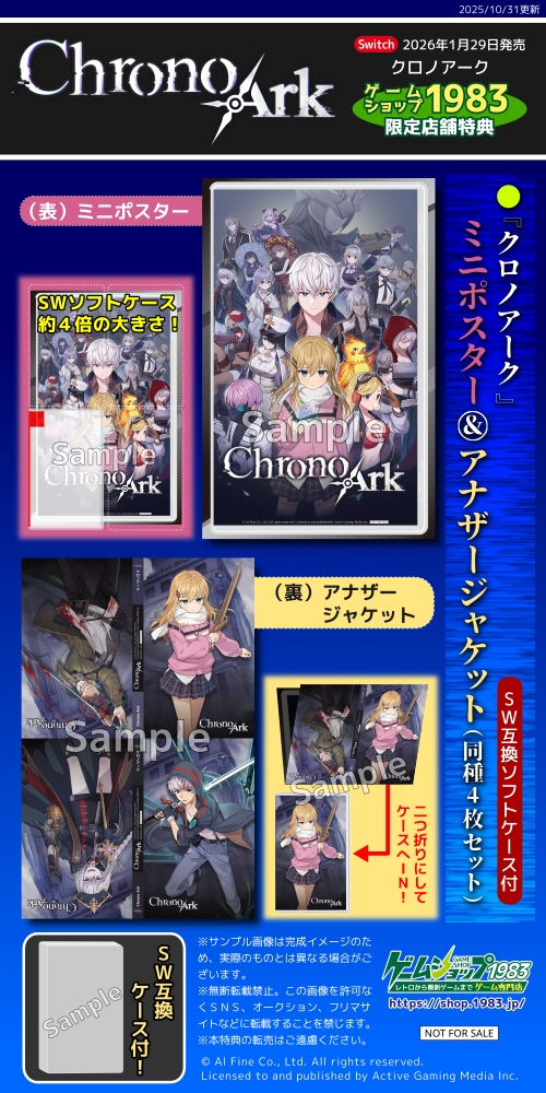 2026/01/29発売 2025/09/16ご予約受付開始 2025/10/05更新 2025/10/31更新しました。 →公式ページ 20人の仲間それぞれに好感度があり、掛け合いも変化。周回することで伏線や謎が明らかになる 奥深いストーリー、パーティ全滅で全てが初期化のデッキ構築型ローグライクRPG 【メーカー初回特典】 ・70ページ相当の豪華仕様特製アートブック 1983限定特典 ・ 4倍ジャケットミニポスター(裏面アナザージャケット) 4枚セット+SW互換ソフトケース (ルシー・ヘイン・アザール・カロン 4名分のアナザージャケット) ※ 同じ発売日のソフトとのまとめご予約や銀行振り込みでの決済、もしくはPayPal手数料ご負担いただくことで1983限定特典を増量サービスいたします。 ![]()