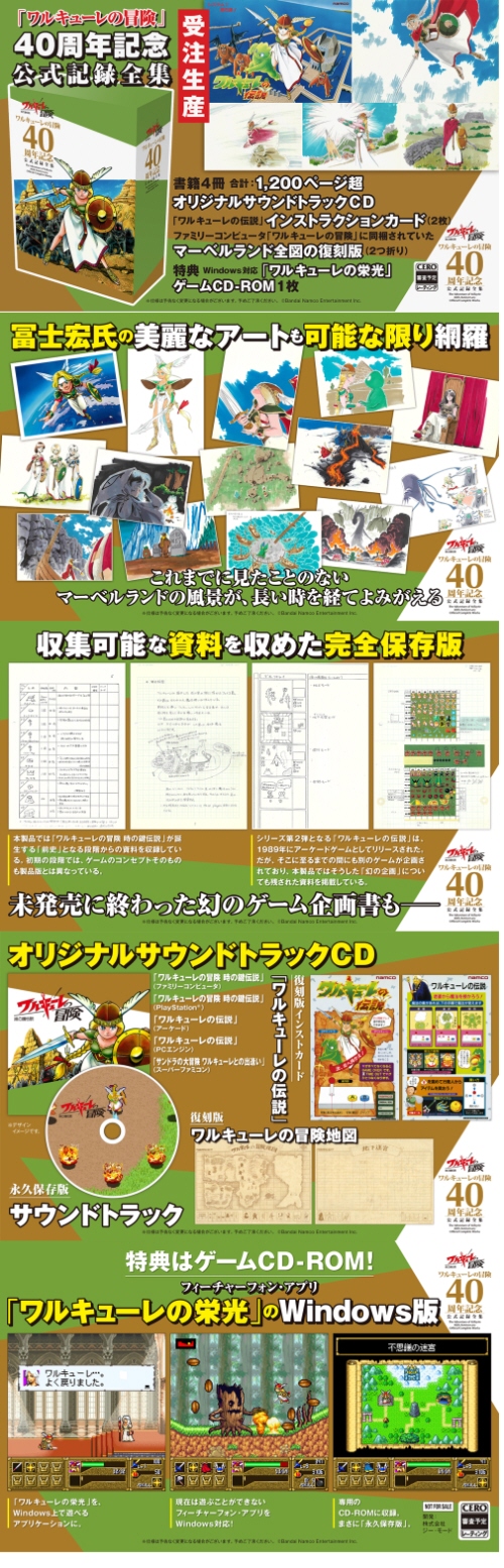 ISBN:978-4-8156-3971-6 2026/03/19発売 2025/10/24ご予約受付開始 2026/01/12迄の受注品 ■内容:書籍4冊+サントラCD+ゲームCD-ROM1枚+復刻インストカード2枚+「ワルキューレの冒険地図」復刻版 ■サイズ:三方背 縦310×横220×厚さ100mm 4600g 化粧箱の外側に保護用に段ボール外装あり ■発行:バンダイナムコエンターテインメント ■発売:SBクリエイティブ →公式ページ