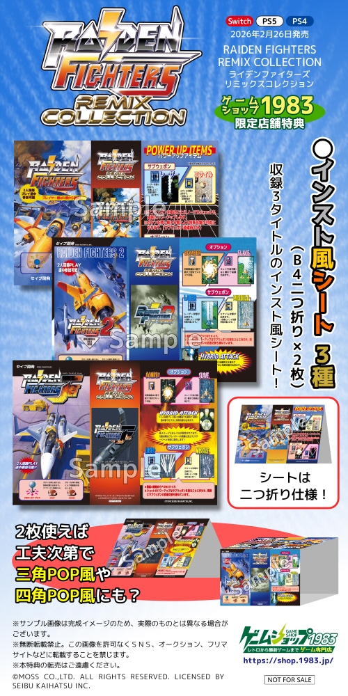 2026/02/26発売 2025/10/30登録 2026/02/25入荷しました。 →公式ページ 【収録タイトル】 ・ライデンファイターズ (日本版/海外版) ・ライデンファイターズ2(日本版/海外版) ・ライデンファイターズJET(日本版/海外版) 音源のリミックスや様々な便利機能搭載 【同梱物】 ・オリジナルサントラCD (3枚組) ・インストラクションカード アクリルスタンド3種 ・復刻小冊子『ライデンファイターズを10倍おもしろくする本』 ・着せ替えジャケット3種 ・天神英貴氏 描き下ろし仕様スペシャルボックス 1983限定特典 ・ インストカード3種シート(B5判の3倍サイズで折るとB5サイズ) ・限定版同梱の着せ替えジャケット用互換ソフトケース <<< その他様々なPS4ソフトはこちらをクリックしてください https://1983.jp/j/GJ01 >>> ![]()