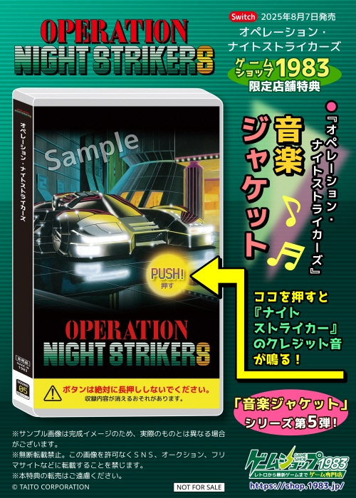 ニンテンドースイッチ用/Nintendo Switch用新品ソフト JAN 49886112241752025/08/07発売 2025/03/28登録 2025/04/15更新 2025/07/09更新 2025/08/06入荷 2025/08/28入荷 2025/11/08更新 2025/11/13更新 2025/11/15入荷 2026/01/23更新 2026/01/29入荷しました。 →公式ページ ガンシューティング「オペレーションシリーズ」2作と、そこから派生した「スペースガン」、3Dスクロールシューティングの金字塔「ナイトストライカー」の4タイトルを収録 移植は有限会社エムツーが全タイトルを担当、アーケード移植版ではゲーム攻略に役立つ各種「ガジェット」表示の他、ネットワークランキング、ゲーム中のセーブ/ロード機能、リプレイ機能など追加 【収録タイトル】 ・オペレーションウルフ(AC版、FC版、NES版、マスターシステム版) ・オペレーションサンダーボルト(AC版、SNES版) ・ナイトストライカー(AC版、MDCD版) ・スペースガン(AC版、マスターシステム版) 1983限定特典 ・ ナイトストライカーボタン (押すとナイトストライカーのクレジット音が鳴るSW風のジャケット+ケース)+想定ジャケット ▼以下の動画は1983限定特典の試作中の動画で、このタイトルとは関係の無いタイトルでの特典試作中のものとなります。